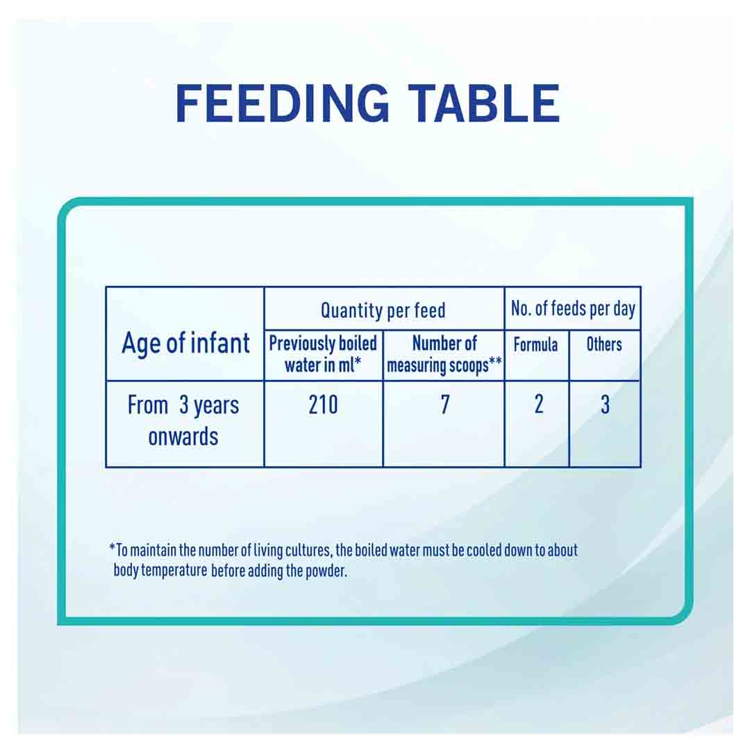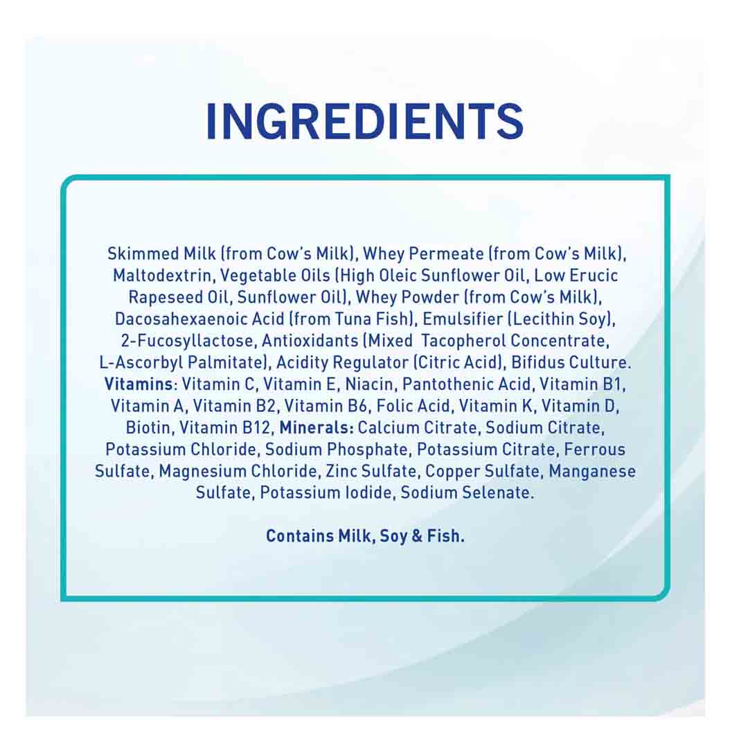 Skimmed dried cow’s milk, lactose, whey protein (from cow’s milk), palm olein, low erucic acid rapeseed oil, coconut oil, sunflower oil, emulsifier (soya lecithin), maltodextrin, fish oil, minerals & vitamins, lacotbacilus culture, Bifidus culture.